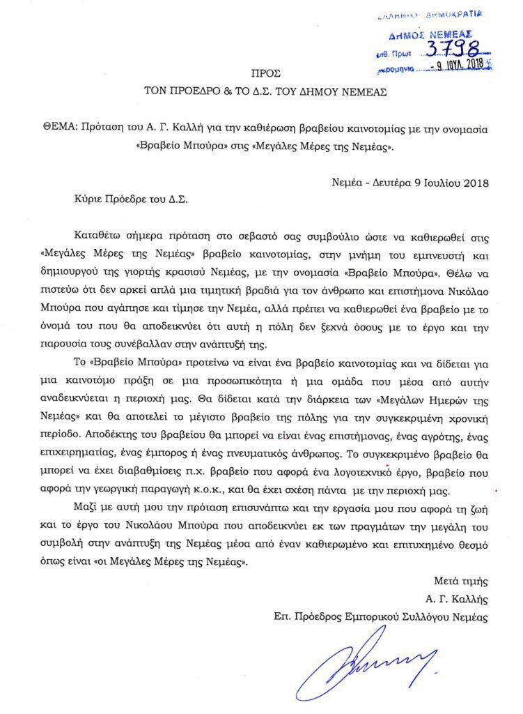 Υ.Γ.1. Το κείμενο αυτό είναι συγχρόνως μια επίσημη πρόταση στον Δήμο Νεμέας όπως καθιερωθεί στις «Μεγάλες Μέρες της Νεμέας» ένα βραβείο καινοτομίας με την ονομασία «ΒΡΑΒΕΙΟ ΜΠΟΥΡΑ». Θέλω να πιστεύω πως θα είναι ο ελάχιστος φόρος τιμής σ’ έναν σπουδαίο άνθρωπο που τίμησε την Νεμέα με το έργο του.