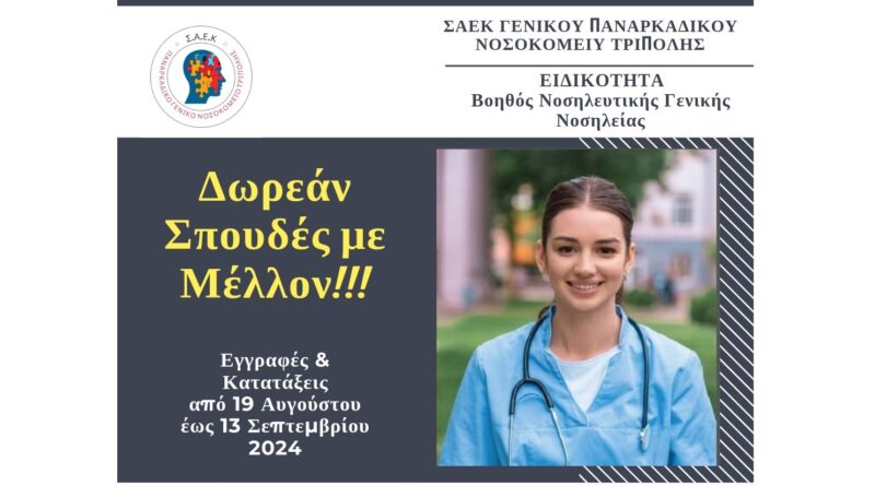 Συνεχίζονται οι Εγγραφές στη Σχολή Ανώτερης Επαγγελματικής Κατάρτισης (ΣΑΕΚ) του Παναρκαδικού Νοσοκομείου Τρίπολης