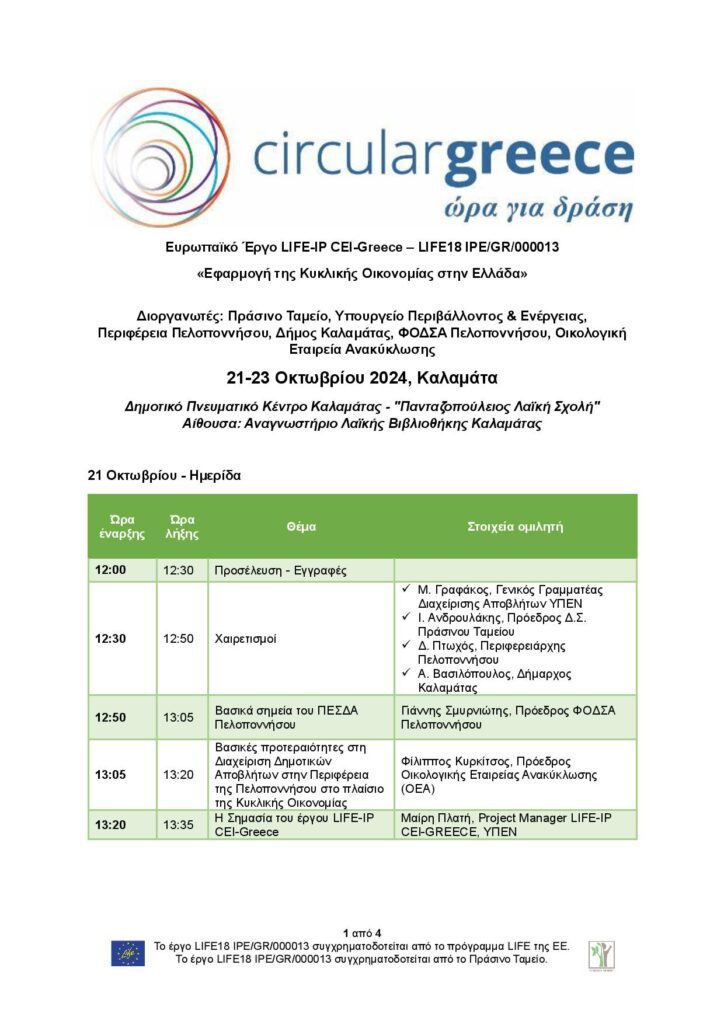 Το Πράσινο Ταμείο, το Υπουργείο Περιβάλλοντος και Ενέργειας, η Περιφέρεια Πελοποννήσου, ο Δήμος Καλαμάτας, ο Φορέας Διαχείρισης Στερεών Αποβλήτων Πελοποννήσου (Φο.Δ.Σ.Α.) και η Οικολογική Εταιρεία Ανακύκλωσης (ΟΕΑ) συνδιοργανώνουν και σας προσκαλούν στην «Ημερίδα Ενημέρωσης και στο Περιφερειακό Εργαστήριο Κυκλικής Οικονομίας», από τις 21 έως και τις 23 Οκτωβρίου 2024, στην Καλαμάτα (Δημοτικό Πνευματικό Κέντρο Καλαμάτας – “Πανταζοπούλειος Λαϊκή Σχολή”, Αίθουσα: Αναγνωστήριο Λαϊκής Βιβλιοθήκης Καλαμάτας), στο πλαίσιο του Έργου LIFE-IP CEI-Greece – LIFE18 IPE/GR/000013 «Εφαρμογή της Κυκλικής Οικονομίας στην Ελλάδα». Ακολουθεί η σχετική ενημέρωση από τον συνδιοργανωτή Φο.Δ.Σ.Α Πελοποννήσου