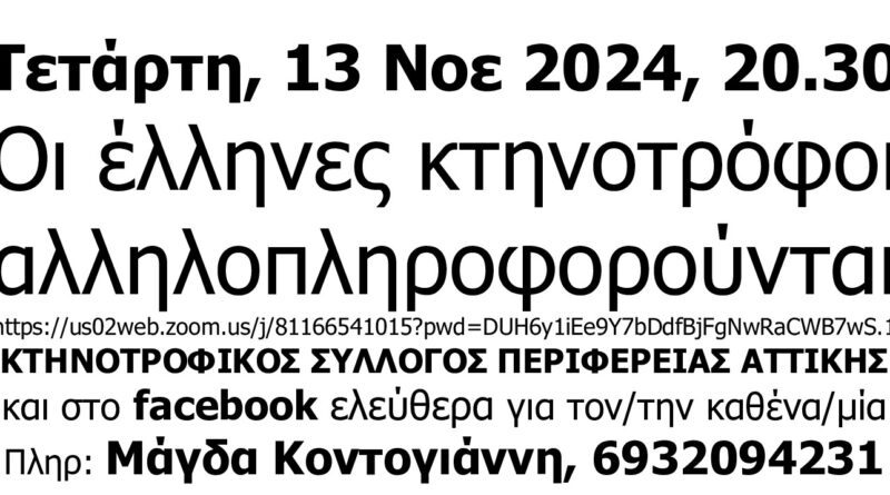 Στις 4/11/2024 έγινε ανοικτή δημόσια συζήτηση με κτηνοτρόφους από την Ελλάδα, στις 11/11/2024 έγινε «ευρεία σύσκεψη με εκπροσώπους …» στο ΥπΑΑΤ και στις 13 Νοε 2024, στις 20.30 συζητούν οι κτηνοτρόφοι σε ανοικτή συζήτηση στο https://us02web.zoom.us/j/81166541015?pwd=DUH6y1iEe9Y7bDdfBjFgNwRaCWB7wS.1 και στο facebook στο προφίλ του ΚΤΗΝΟΤΡΟΦΙΚΟΥ ΣΥΛΛΟΓΟΥ ΠΕΡΙΦΕΡΕΙΑΣ ΑΤΤΙΚΗΣ ΑΓΙΟΣ ΓΕΩΡΓΙΟΣ. Πληρ κα Μάγδα Κοντογιάννη, 6932094231.