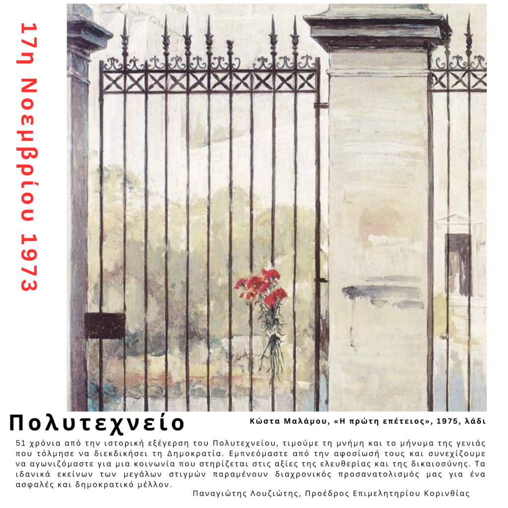 51 χρόνια από την ιστορική εξέγερση του Πολυτεχνείου, τιμούμε τη μνήμη και το μήνυμα της γενιάς που τόλμησε να διεκδικήσει τη Δημοκρατία. Εμπνεόμαστε από την αφοσίωσή τους και συνεχίζουμε να αγωνιζόμαστε για μια κοινωνία που στηρίζεται στις αξίες της ελευθερίας και της δικαιοσύνης.