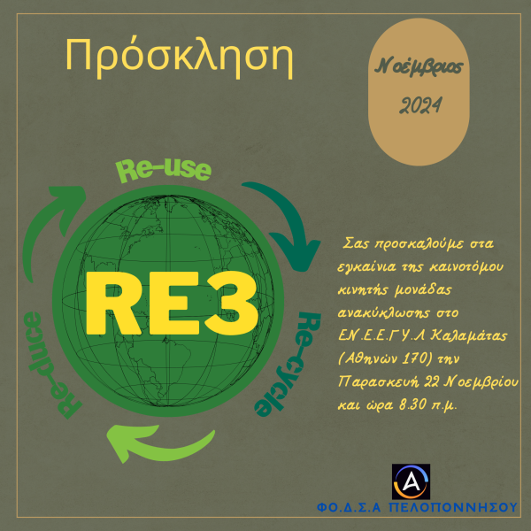 Την Παρασκευή 22 Νοεμβρίου 2024 από το πρωί στις 8:30 π.μ. στον εξωτερικό χώρο του Ειδικού Σχολείου Καλαμάτας (Αθηνών 170) θα πραγματοποιηθεί η έναρξη της δράσης η οποία εντάσσεται στο Εκπαιδευτικό Πρόγραμμα για την Ανακύκλωση και την βιώσιμη διαχείριση αποβλήτων στα σχολεία και πραγματοποιήται από τον Φορέα Διαχείρισης Στερεών Αποβλήτων της Περιφέρειας Πελοποννήσου. Η θεματολογία εστιάζει στην επείγουσα ανάγκη αντιμετώπισης του προβλήματος της ανακύκλωσης και της βιώσιμης διαχείρισης αποβλήτων και η διαδικασία θα περιλαμβάνει διδασκαλία αλλά και διαδραστικά μαθήματα που θα γίνονται και θα έχουν διάρκεια μιας διδακτικής ώρας για κάθε τμήμα που θα συμμετέχει στο πρόγραμμα.