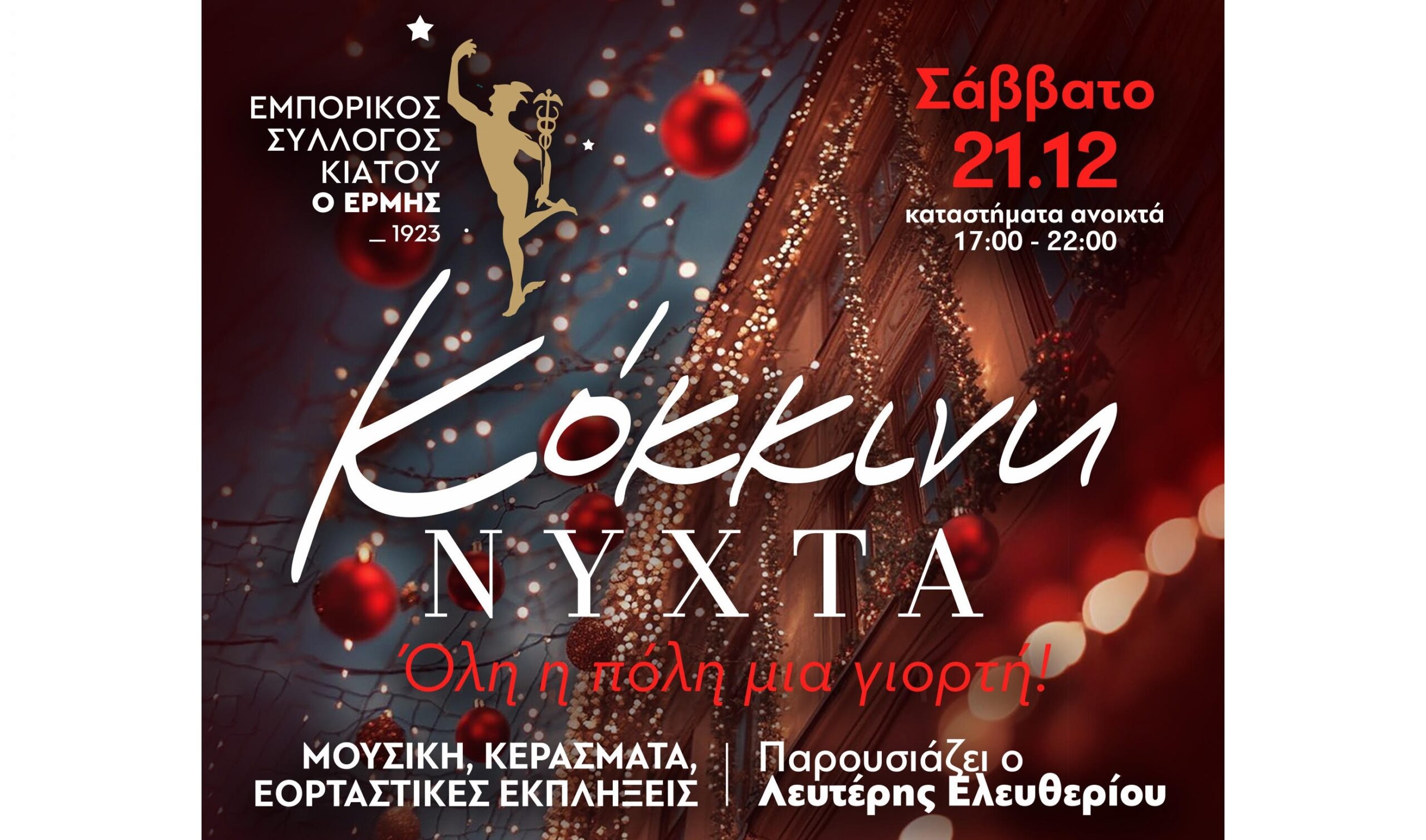 Φοράμε τα γιορτινά μας και σας περιμένουμε το Σάββατο 21 Δεκεμβρίου στο Κιάτο από τις 17:00 μέχρι τις 22:00 για μια ξεχωριστή, γιορτινή «Κόκκινη Νύχτα» γεμάτη μουσική , χορό και πολλές εκπλήξεις!!!