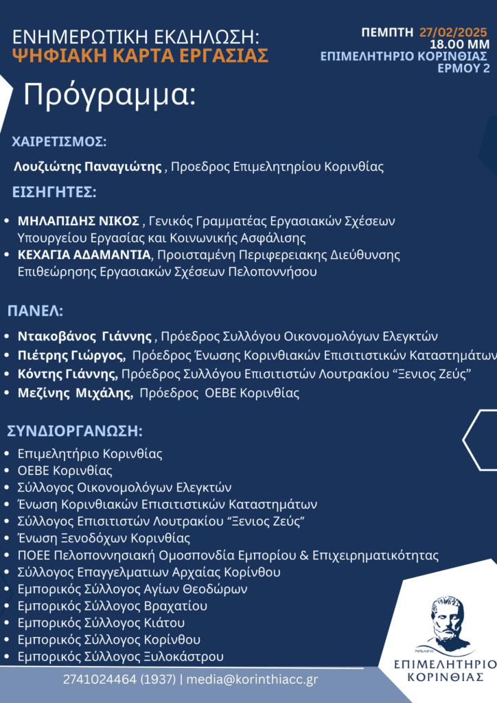 Η ενημερωτική εκδήλωση με θέμα «Ψηφιακή Κάρτα Εργασίας» θα πραγματοποιηθεί την Πέμπτη 27 Φεβρουαρίου 2025 στις 18:00 μ.μ. στο Επιμελητήριο Κορινθίας (Ερμού 2, Κόρινθος), σε συνδιοργάνωση με σημαντικούς φορείς και οργανισμούς του νομού.
