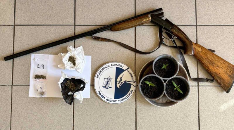 - -3- φυτά κάνναβης, ύψους έως -5- εκατοστών περίπου, ποσότητες κάνναβης, συνολικού βάρους -12,3- γραμμαρίων και -1- κυνηγετικό όπλο, στη Μεσσηνία.