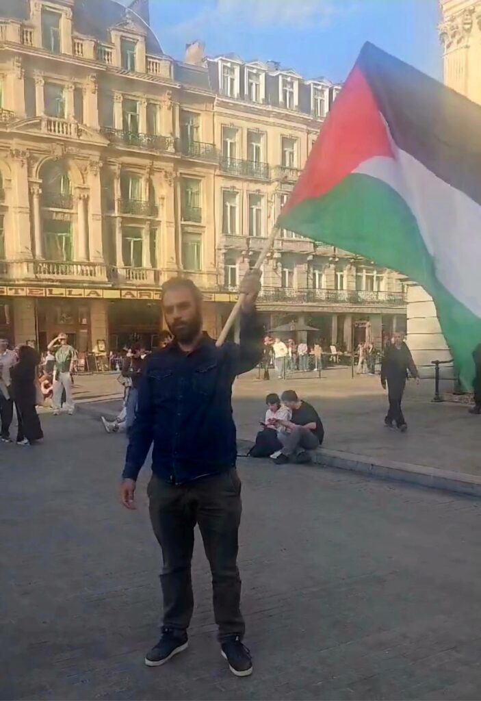 Μπροστά από το ιστορικό κτήριο του Χρηματιστηρίου των Βρυξελλών (Beurs van Brussel), υπό το άγρυπνο βλέμμα των Βέλγων αστυνομικών , ύψωσε την παλαιστινιακή σημαία, εκφράζοντας την αλληλεγγύη του στον Παλαιστινιακό λαό και καταδικάζοντας τη συνεχιζόμενη γενοκτονία στη Γάζα.