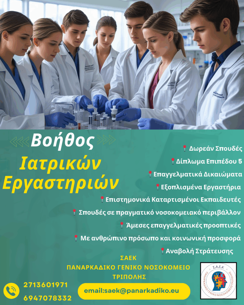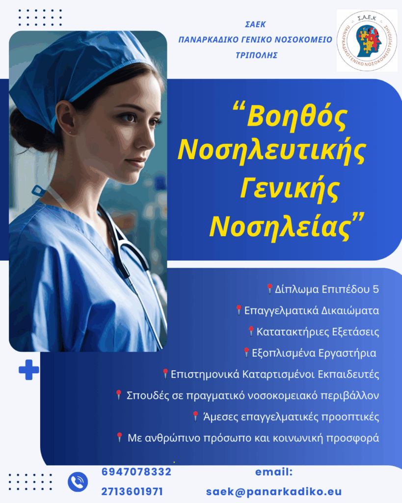 Νέες ειδικότητες στη ΣΑΕΚ του Παναρκαδικού Νοσοκομείου Τρίπολης για το έτος 2025-2026