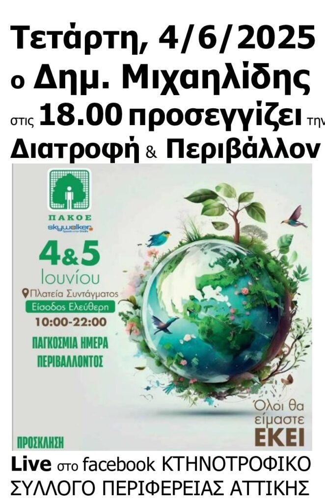 Το διήμερο 4 & 5 Ιουν 2025, από 10.00 έως 22.00, στην πλατεία Συντάγματος, το ΠΑΚΟΕ και το Skywalker μας περιμένουν και την Τετάρτη, 4 Ιουν 2025, 17.30-19.00 στις ομιλίες μεταξύ άλλων θα μιλήσει ο Δημ. Μιχαηλίδης στις 18.00 στην πλατεία Συντάγματος με θέμα: ΠΕΡΙΒΑΛΛΟΝ & ΔΙΑΤΡΟΦΗ.