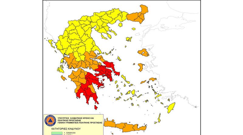 Σύμφωνα με το Χάρτη Πρόβλεψης Κινδύνου Πυρκαγιάς, τον οποίο εκδίδει η Γενική Γραμματεία Πολιτικής Προστασίας του Υπουργείου Κλιματικής Κρίσης & Πολιτικής Προστασίας για το Σάββατο 26 Ιουλίου προβλέπεται Ακραίος κίνδυνος πυρκαγιάς – Κατάσταση Συναγερμού (κατηγορία κινδύνου 5) για την Περιφέρεια Πελοποννήσου