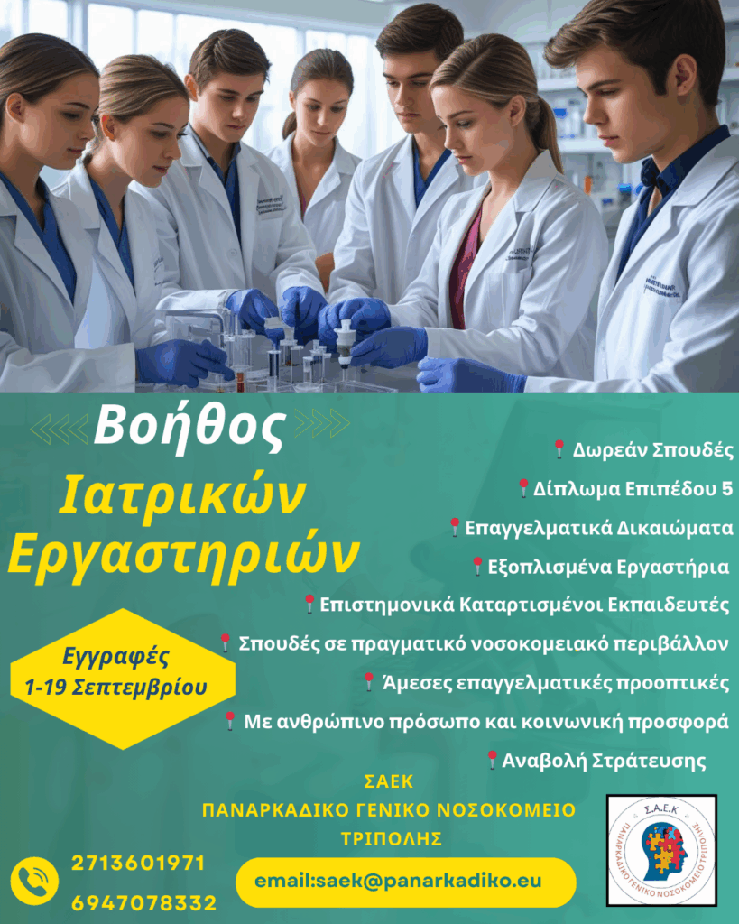 Συνεχίζονται οι εγγραφές στη Σ.Α.Ε.Κ του Παναρκαδικού Γενικού Νοσοκομείου Τρίπολης για το έτος 2025-2026 έως και 19 Σεπτεμβρίου 2025