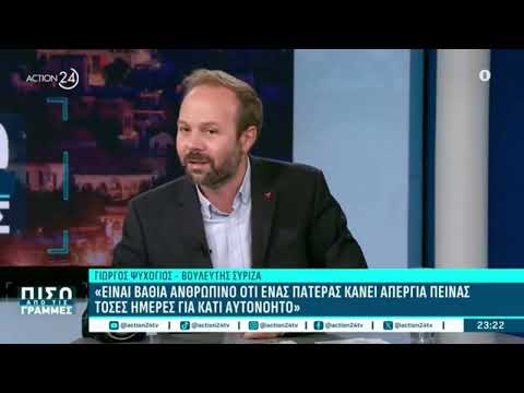 Ο βουλευτής του ΣΥΡΙΖΑ-ΠΣ, Γιώργος Ψυχογιός, ήταν καλεσμένος στον τηλεοπτικό σταθμό Action 24 και στην εκπομπή “Πίσω από τις γραμμές”, όπου, μεταξύ άλλων, αναφέρθηκε στο ανθρώπινο και δίκαιο αίτημα του Πάνου Ρούτσι που συνεχίζει την απεργία πείνας, ενώ απαντώντας σε άλλο ερώτημα μίλησε για το έντονο κοινωνικό αίτημα για μέτωπο προοδευτικών και αριστερών δυνάμεων απέναντι στη λεηλασία της κυβέρνησης Μητσοτάκη, αλλά και τις θέσεις του ΣΥΡΙΖΑ-ΠΣ για την «Προοδευτική Ελλάδα».