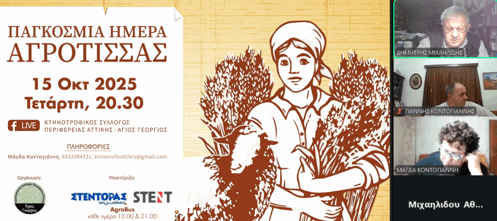 4.Ο Κτηνοτροφικός Σύλλογος Περιφέρειας Αττικής προσκαλεί όλους και ιδιαίτερα όλες τις αγρότισσες, την Τετάρτη, 15 Οκτ 2025, στις 20.30 στην ανοικτή διαδικτυακή συνάντηση για τον «Αθέατο-αδήλωτο ρόλο της αγρότισσας» https://us02web.zoom.us/j/85789474307?pwd=0agWtbHdvfoXHwIsURgNJFuNhb49aq.1 & στο facebook (live). Η πρόσκληση είναι ανοιχτή, αλλά αξίζει να σταλθούν μερικές προσκλήσεις υπενθύμισης με φροντίδα της κας Μάγδας Κοντογιάννη.