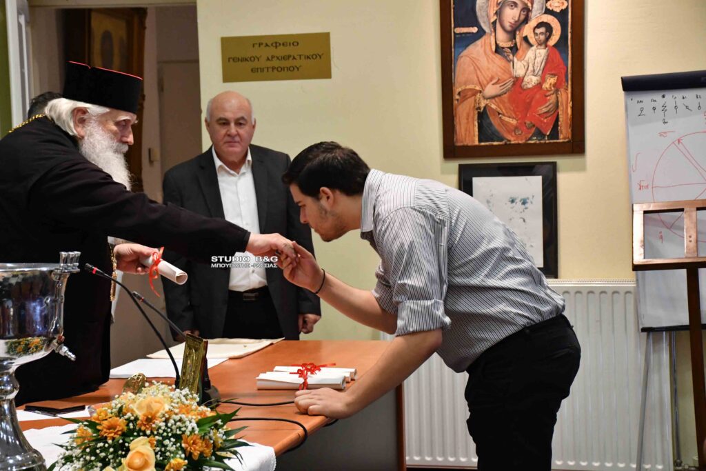 Στη συνέχεια παρουσία του Μητροπολίτη Αργολίδας πραγματοποιήθηκε η απονομή των Πτυχίων και Διπλωμάτων των επιτυχόντων στις Απολυτήριες εξετάσεις τού περασμένου έτους.
