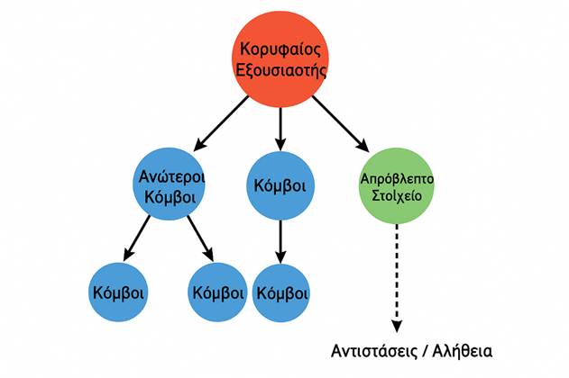 Τότε η εσωτερική αφήγηση των Dunning-Kruger εξουσιαστών καταρρέει γιατί αισθάνονται ως ηλίθιοι, η διαφθορά μετατρέπεται σε μία τεκμηριωμένη γνώση της αδικίας ενώ το απρόβλεπτο στοιχείο γίνεται το αντικείμενο κριτικής που θα εμφανίζεται διαρκώς μπροστά τους. Από την άλλη όμως, το σύστημα επιβεβαιώνει τη δύναμη του περνώντας το μήνυμα ότι οι «δικοί» του κερδίζουν γιατί είναι αυτοί που αναπαραγάγουν το δίκτυο. Το δίκτυο λειτουργεί και ως ασπίδα διαφθοράς γιατί όλοι κάνουν το ίδιο και τηρούν τους κανόνες του. Οι μεμονωμένοι κόμβοι του δικτύου (π.χ. τα στελέχη) πρέπει να παρέχουν επίφαση νομιμοποίησης στο δίκτυο αναπαράγοντας το ψέμα στον τομέα ευθύνης τους.