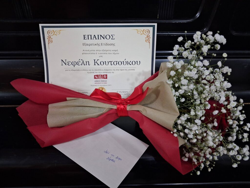 Ιδιαίτερα συγκινητική ήταν για όλους εμάς που συμμετείχαμε η Βράβευση απο τον Δήμο μας της νεαρής Νεφέλης Κουτσούκου (το γένος Δενέζη) από την Αρχαία Νεμέα, καθώς έχει αποσπάσει πλήθος πανελληνίων Βραβείων στο φλάουτο και στο πιάνο, τιμώντας με μοναδικό τρόπο τον τόπο καταγωγής της!! Της ευχόμαστε καλή πρόοδο και στους επόμενους στόχους της!!