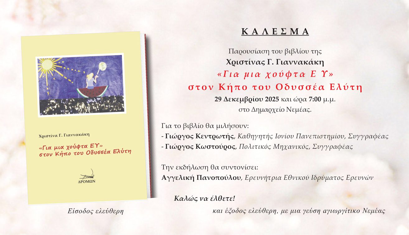 Νεμέα: Παρουσίαση του βιβλίου της Χριστίνας Γιαννακάκη ”Για μια χούφτα Ε Υ” στον Κήπο του Οδυσσέα Ελύτη