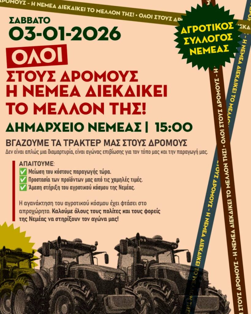 Αγροτικός Σύλλογος Νεμέας: Όλοι στους Δρόμους – Η Νεμέα Διεκδικεί το Μέλλον της!