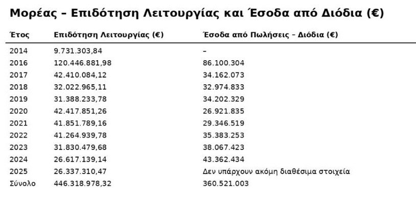 Πιο συγκεκριμένα, στις 24/11/2025, στο ξεκίνημα των αγροτικών κινητοποιήσεων, το υπουργείο Υποδομών και Μεταφορών ενέκρινε την 40ή πληρωμή της Πρόσθετης Επιδότησης Λειτουργίας προς τον «Μορέα», ύψους περίπου 11 εκατ. ευρώ. Αυτά τα ποσά προστέθηκαν στις υπόλοιπες 3 δόσεις του 2025, όπου οι συνολικές επιδοτήσεις (τακτικές και πρόσθετες) έφτασαν για το έτος τα 26.337.310,47 ευρώ! Κι ενώ οι εγγυημένες τιμές στα προϊόντα, ώστε να διασφαλίζουν την επιβίωση στους βιοπαλαιστές αγρότες, είναι «παράνομες» – για τον «Μορέα», με τη «βούλα» του κράτος και της ΕΕ, διασφαλίζεται εγγυημένη κερδοφορία! Από το 2016 έως το 2025, η κοινοπραξία έχει εισπράξει 446 εκατ. ευρώ από κρατικές επιδοτήσεις και 360,5 εκατ. ευρώ από διόδια. Δηλαδή πάνω από 800 εκατ. ευρώ έσοδα, πληρωμένα είτε άμεσα από το κράτος, είτε από τις τσέπες του λαού μέσω πανάκριβων διοδίων. Συμπέρασμα: «Δημοσιονομικά όρια» για τους αγρότες – απεριόριστη στήριξη για μονοπώλια σαν τον «Μορέα». «Αδύνατη» η αναπλήρωση του χαμένου εισοδήματος για τους αγρότες – εξασφαλισμένη για τον «Μορέα» με την πολιτική όλων των κυβερνήσεων και της ΕΕ.
