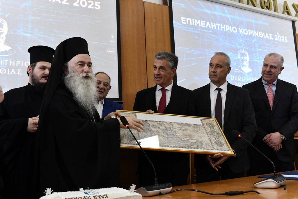 Σε ένδειξη σεβασμού και τιμής προς τον Σεβασμιώτατο Μητροπολίτη Κορίνθου, ο Πρόεδρος του Επιμελητηρίου κ. Παναγιώτης Λουζιώτηςκαι τα μέλη του Δ.Σ.,προσέφεραν έναν πίνακα που απεικονίζει τη δεύτερη περιοδεία του Απόστολου Παύλου, ως συμβολική σύνδεση της αποστολικής του πορείας με την Κόρινθο. Το έργο έχει φιλοτεχνηθεί από τον Κορίνθιο Βλάση Τσοτσώνη, διακεκριμένο ζωγράφο, αγιογράφο και ψηφιδογράφο, γνωστό και ως «ο ζωγράφος των Αγγέλων», με καταγωγή από το Βέλο Κορινθίας.