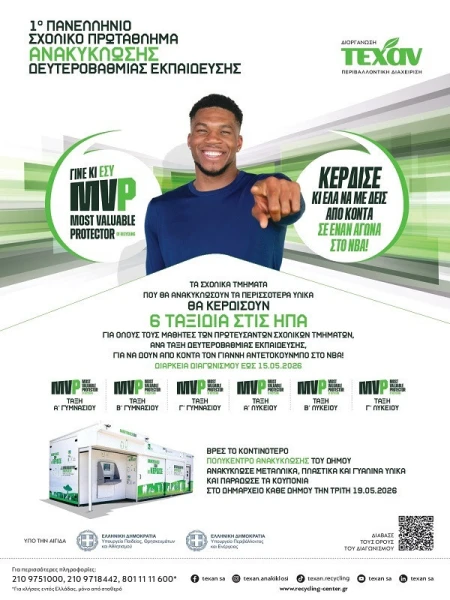 Η ΤΕΧΑΝ Α.Β.Ε.Ε.πρωτοπόρος στον τομέα της κυκλικής οικονομίας και της ανακύκλωσης, ενισχύει έμπρακτα τη δέσμευσή της για την προώθηση της περιβαλλοντικής εκπαίδευσης και διοργανώνει το «1οΠανελλήνιο Σχολικό Πρωτάθλημα Ανακύκλωσης», το οποίο έχει ξεκινήσει και θα διαρκέσει έως 15 Μαΐου 2026.