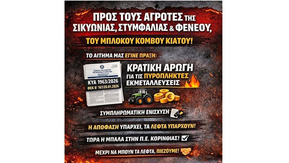 Σήμερα έχουμε καλά νέα για τους αγρότες και κτηνοτρόφους της Στυμφαλίας και Φενεού που συμμετείχαν στο Μπλόκο στον Κόμβο Κιάτου: