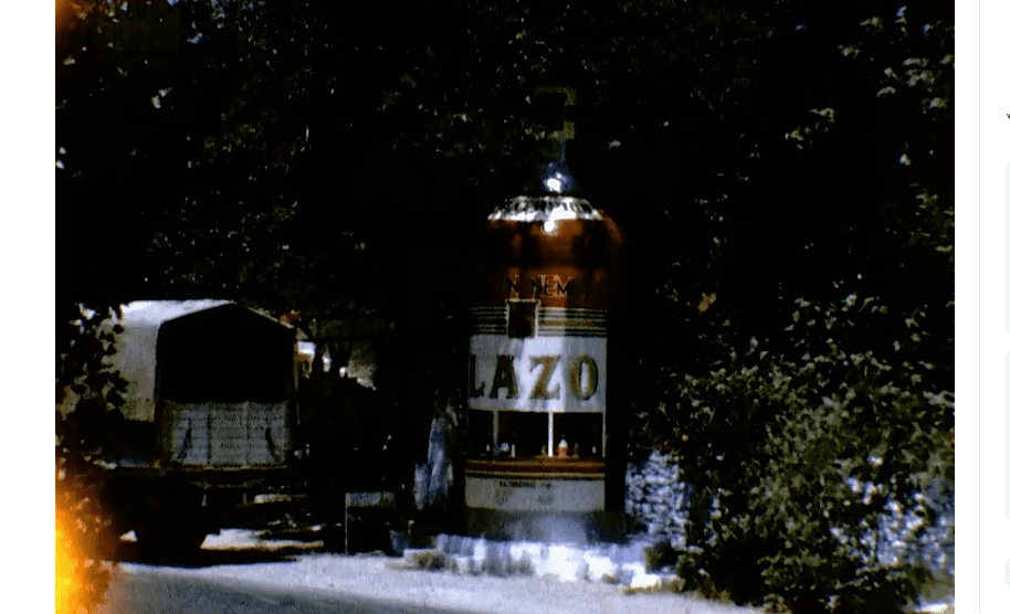 Ο κινηματογραφιστής έχει σταματήσει στην άκρη του δρόμου και καταγράφει ένα διαφημιστικό κιόσκι του οινοποιείου «Λαζόπουλος» (Lazo), στο σχήμα ενός μεγάλου μπουκαλιού.