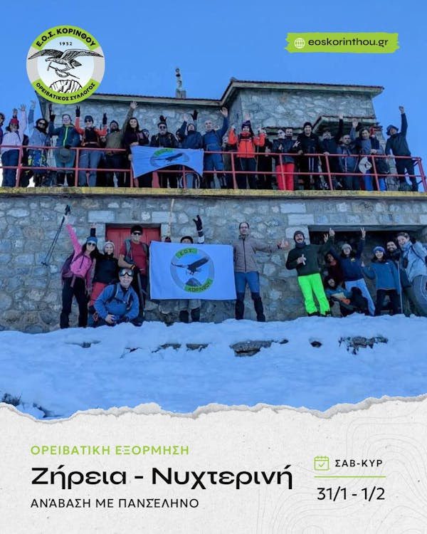 Ο ΕΟΣ Κορίνθου σας προσκαλεί σε μια μοναδική χειμερινή εμπειρία: νυχτερινή ανάβαση στη Μεγάλη Ζήρεια, προς την κορυφή Σημείο (2.374 μ.), κάτω από το μαγευτικό φως της Πανσελήνου του Χιονιού.