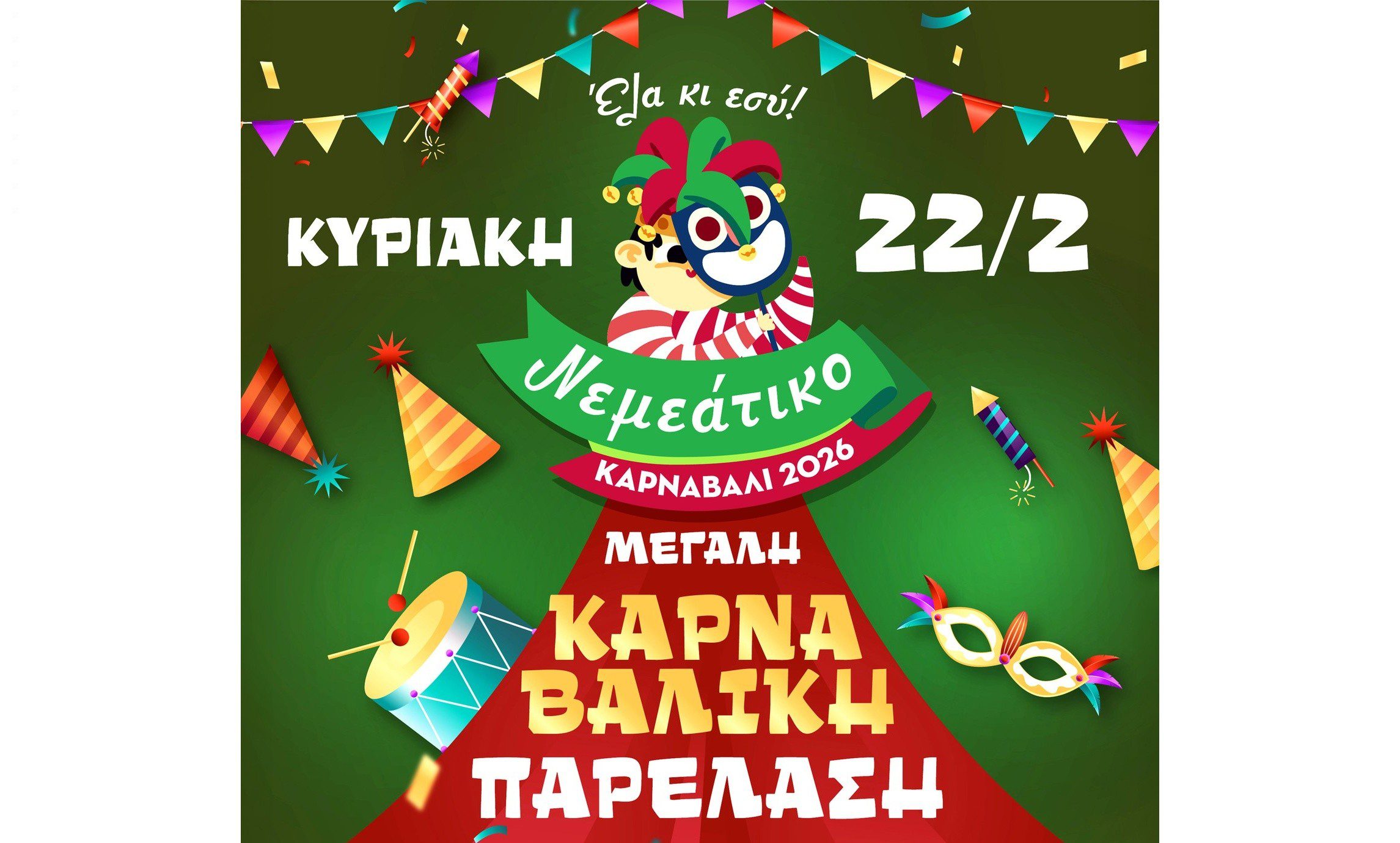 Με κέφι, χρώμα, μουσική και σατιρική διάθεση, το Νεμεάτικο Καρναβάλι υπόσχεται μια ημέρα γεμάτη ζωντάνια και χαμόγελα, καλώντας όλους να συμμετάσχουν στη γιορτή.