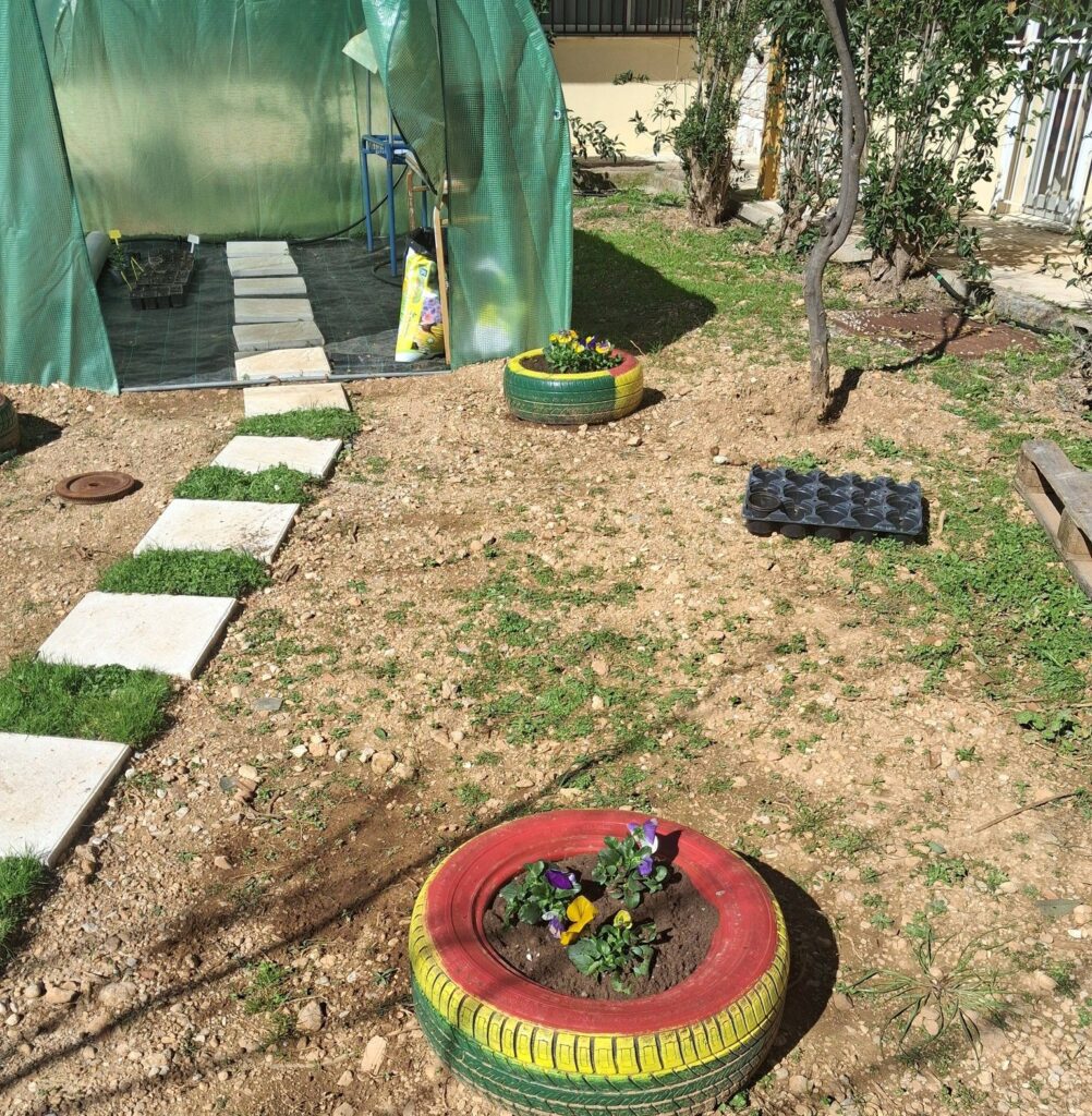 Όσο για τους πανσέδες μέσα στα λάστιχα αυτοκινήτου, είναι για να δώσουν μια νότα πολυχρωμίας και ομορφιάς στον σχολικό λαχανόκηπο!