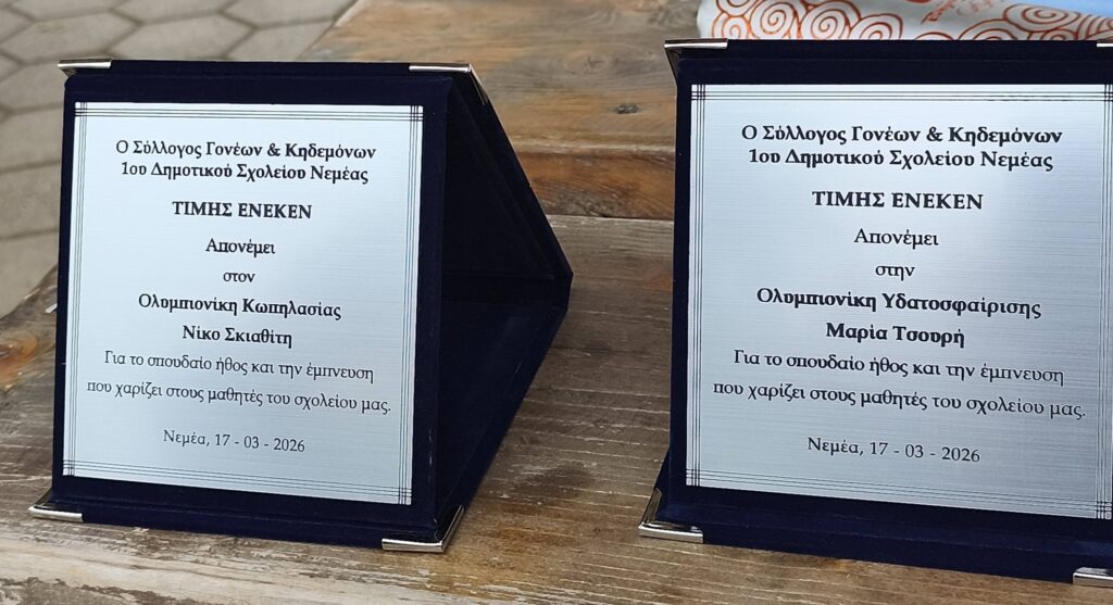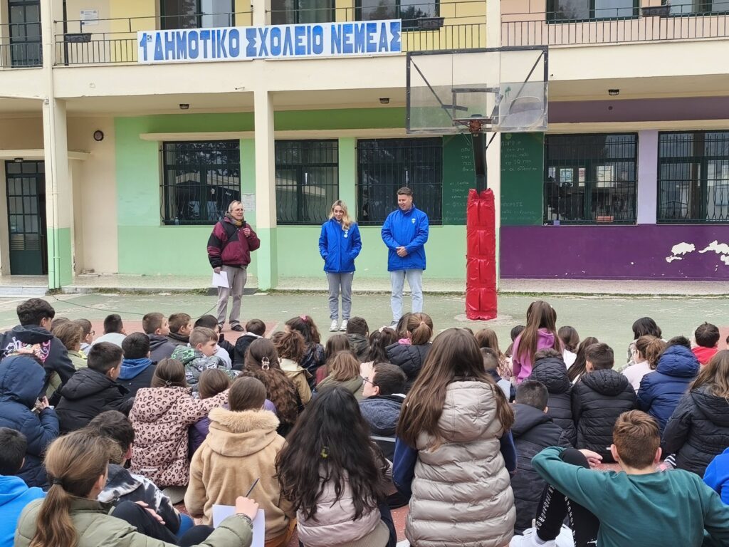Την Τρίτη 17 Μαρτίου, το 1ο Δημοτικό Σχολείο Νεμέας έζησε μια από τις πιο λαμπρές στιγμές της σχολικής του χρονιάς, καθώς οι αίθουσες και το προαύλιό του γέμισαν με το φως και τις αξίες του Ολυμπισμού. Σε μια κίνηση υψηλού συμβολισμού και παιδαγωγικής αξίας, το σχολείο είχε την τιμή να υποδεχθεί δύο κορυφαίους εκπροσώπους του ελληνικού αθλητισμού: τον χάλκινο Ολυμπιονίκη της κωπηλασίας Νίκο Σκιαθίτη (Αθήνα 2004) και την Ολυμπιονίκη της υδατοσφαίρισης Μαρία Τσουρή (Πεκίνο 2008).