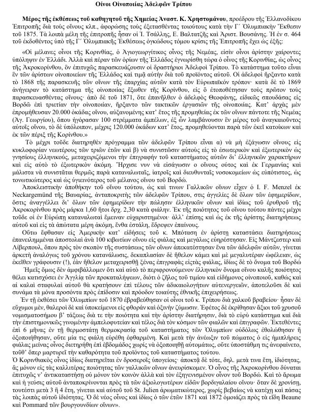 Το εν λόγω οινοποιείο (όπως και ο Δήμος Νεμέας) συμμετείχε το 1875 στην έκθεση προϊόντων Γ΄ Ολύμπια στην Αθήνα. Εκεί μάλιστα βραβεύτηκε και η σχετική εισήγηση της Ελλανόδικης Επιτροπής, την οποία υπογράφει ο πρόεδρός της τότε Καθηγητής Γενικής Χημείας του Πανεπιστημίου Αθηνών Αναστάσιος Χρηστομάνος, ιδιαίτερα αναλυτική και εμπεριστατωμένη, αποτελεί ουσιαστικά έναν διθύραμβο για «τούς μέλανες οίνους της Κορινθίας» που παρήγαγε το οινοποιείο Τρίπου δηλαδή «τον Αγιογεωργίτικο οίνο της Νεμέας» (για όσους ενδιαφέρονται, έχει αναρτηθεί το κείμενο του Χρηστομάνου σε φωτογραφία).