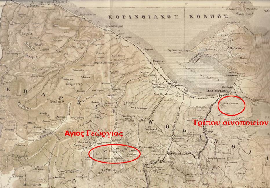 Άγιος Γεώργιος και οινοποιείο Τρίπου σε χάρτη του 1886 (Μηλιαράκης) Απείχαν «επτά ώρες δρόμο» (όπως γράφει ο περιηγητής Ludwig Salvator)