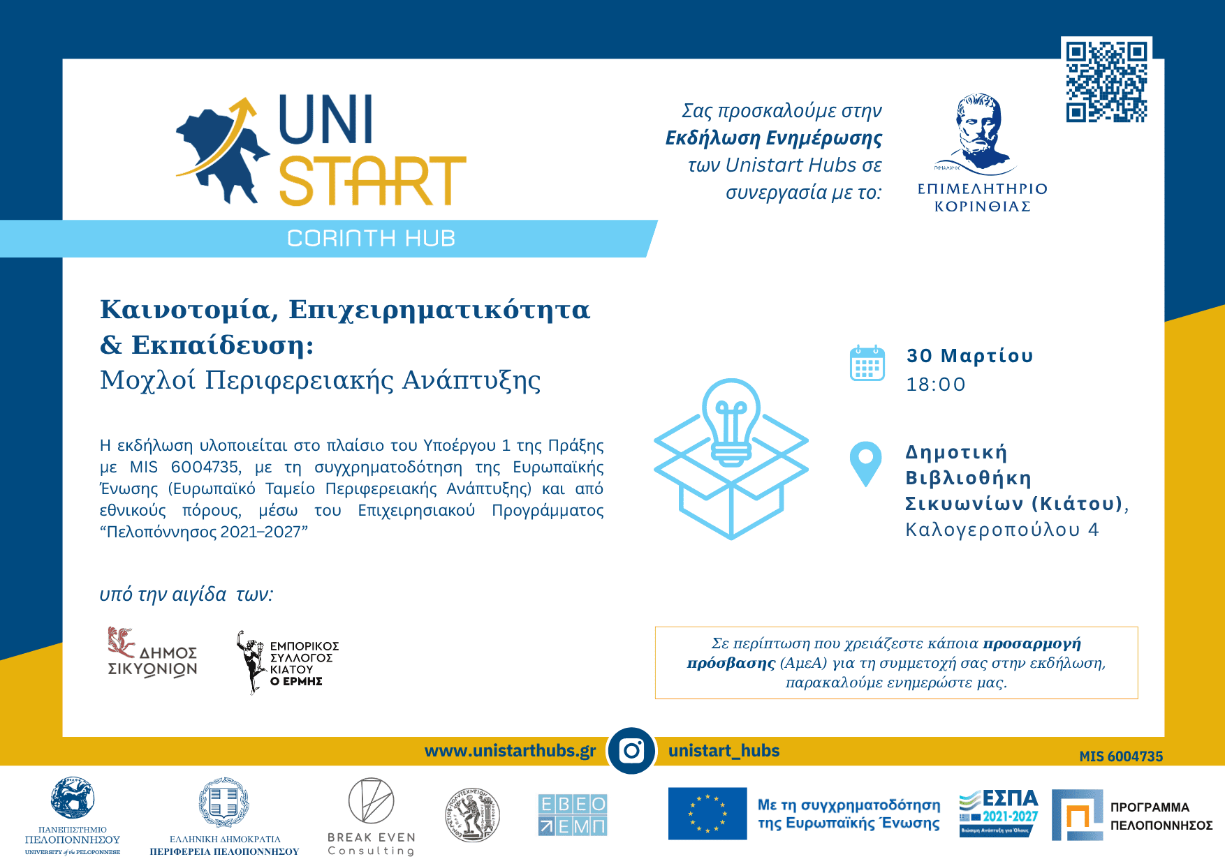 Οι Δομές Επιχειρηματικότητας και Καινοτομίας του Πανεπιστημίου Πελοποννήσου στην Περιφέρεια Πελοποννήσου UniStartHubs, σε συνεργασία με το Επιμελητήριο Κορινθίας, σας προσκαλούν στην εκδήλωση με τίτλο «Καινοτομία, Επιχειρηματικότητα & Εκπαίδευση: Μοχλοί Περιφερειακής Ανάπτυξης», η οποία θα πραγματοποιηθεί τη Δευτέρα 30 Μαρτίου 2026 και ώρα 18:00, στη Δημοτική Βιβλιοθήκη του Δήμου Σικυωνίων, Καλογεροπούλου 4 στο Κιάτο. Η εκδήλωση τελεί υπό την αιγίδα του Δήμου Σικυωνίων και του Εμπορικού Συλλόγου Κιάτου «Ο ΕΡΜΗΣ».