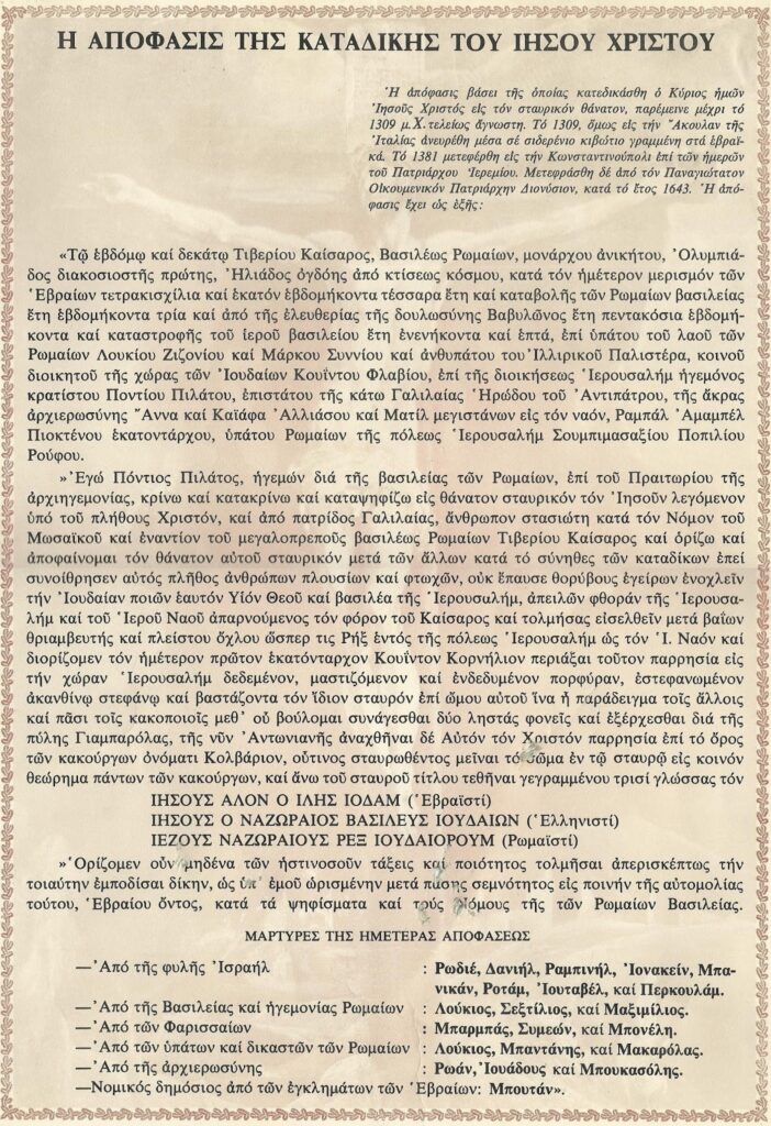 Εγώ Πόντιος Πιλάτος, ηγεμών δια της βασιλείας των Ρωμαίων, επί του Πραιτωρίου της αρχιηγεμονίας, κρίνω και κατακρίνω και καταψηφίζω εις θάνατον σταυρικόν τον Ιησού λεγόμενον υπό του πλήθους Χριστόν, και από πατρίδος Γαλιλαίας, άνθρωπον στασιώτη κατά τον Νόμο του Μωσαϊκού και εναντίον του μεγαλοπρεπούς βασιλέως Ρωμαίων Τιβερίου Καίσαρος και ορίζω και αποφαίνομαι τον θάνατον αυτού σταυρικόν μετά των άλλων κατά το συνήθες των καταδίκων, επεί συνοίθρησεν αυτός πλήθος ανθρώπων πλουσίων και φτωχών, ουκ έπαυσε θορύβους εγείρων, ενοχλείν την Ιουδαίαν ποιών εαυτόν Υιόν Θεού και βασιλέα της Ιερουσαλήμ, απειλών φθοράν της Ιερουσαλήμ και του Ιερού Ναού, απαρνούμενος τον φόρον του Καίσαρος και τολμήσας εισελθείν μετά βαϊων θριαμβευτής και πλείστου όχλου ώσπερ τις Ρήξ εντός της πόλεως Ιερουσαλήμ ως τον Ι. Ναόν και διορίζομεν τον ημέτερον πρώτον εκατόνταρχον Κουϊντον Κορνήλιον περιάξαι τούτον παρρησία εις την χώραν Ιερουσαλήμ δεδεμένον, μαστιζόμενον και ενδεδυμένον πορφύραν, εστεφανωμένον ακάνθινω στεφάνω και βαστάζοντα τον ίδιον σταυρόν επί ώμου αυτού, ίνα ει παράδειγμα τοις άλλοις και πάσι τοις κακοποιοίς μεθ’ ού βούλομαι συνάγεσθαι δύο ληστάς φονείς και εξέρχεσθαι δια της πύλης Γιαμπαρόλας, της νυν Αντωνιανής, αναχθήναι δε Αυτόν τον Χριστόν παρρησία επί το όρος των κακούργων ονόματι Κολβάριον, ούτινος σταυρωθέντος μείναι το σώμα εν τω σταυρώ εις κοινόν θεώρημα πάντων των κακούργων, και άνω του σταυρού τίτλου τεθήναι γεγραμμένου τρισί γλώσσας τον