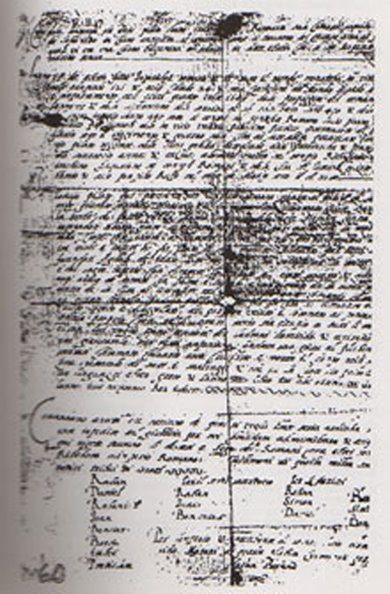 «Τω εβδόμω και δεκάτω Τιβερίου Καίσαρος, Βασιλέως Ρωμαίων, μονάρχου ανικήτου, Ολυμπιάδος διακοσιοστής πρώτης, Ηλιάδος ογδόης από κτίσεως κόσμου, κατά τον ημέτερον μερισμόν των Εβραίων τετράκισχίλια και εκατόν εβδομήκοντα τέσσερα έτη και καταβολής των Ρωμαίων βασιλείας έτη εβδομήκοντα τρία και από της ελευθερίας της δουλωσύνης Βαβυλώνος έτη πεντακόσια εβδομήκοντα και καταστροφής του ιερού βασιλείου έτη εννενήκοντα και επτά, επί υπάτου του λαού των Ρωμαίων Λουκίου Ζιζονίου και Μάρκου Συννίου και ανθυπάτου του Ιλλιρικού Παλιστέρα, κοινού διοικητού της χώρας των Ιουδαίων Κουίντου Φλαβίου, επί της διοικήσεως Ιερουσαλήμ ηγεμόνος κρατίστου Ποντίου Πιλάτου, επιστάτου της Κάτω Γαλιλαίας Ηρώδου του Αντιπάτρου, της άκρας αρχιερωσύνης Άννα και Καιάφα Αλλιάσου και Ματίλ μεγιστάνων εις τον ναόν, Ραμπάλ Αμαμπέλ Πιοκτένου εκατόνταρχου υπάτου Ρωμαίων της πόλεως Ιερουσαλήμ Σουμπιμασάξιου Ποπιλίου Ρούφου.