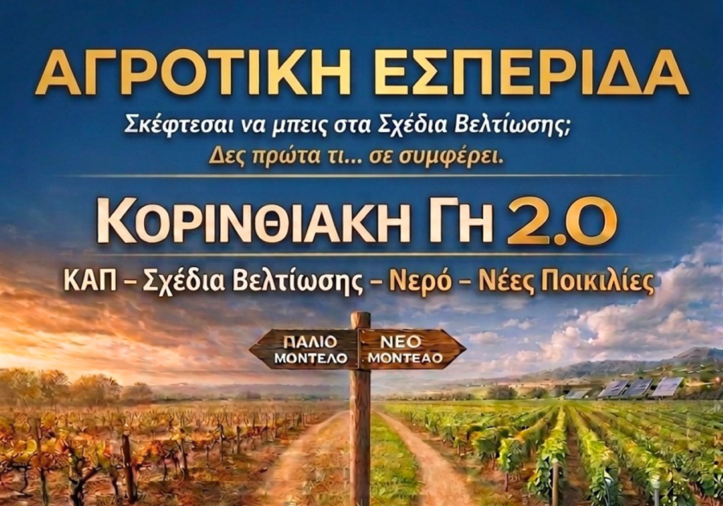 Η γεωργία αλλάζει κατεύθυνση και οι αποφάσεις των παραγωγών γίνονται πλέον πιο κρίσιμες από ποτέ. Σε αυτό το περιβάλλον, όπου η νέα ΚΑΠ, το αυξανόμενο κόστος παραγωγής και οι απαιτήσεις της αγοράς διαμορφώνουν ένα εντελώς διαφορετικό τοπίο, διοργανώνεται η Αγροτική Εσπερίδα «Κορινθιακή Γη 2.0: ΚΑΠ – Σχέδια Βελτίωσης – Νερό – Νέες Ποικιλίες», την Τετάρτη 22 Απριλίου 2026 και ώρα 19:00, στη Δημοτική Βιβλιοθήκη Κιάτου, υπό την αιγίδα του Δήμου Σικυωνίων.