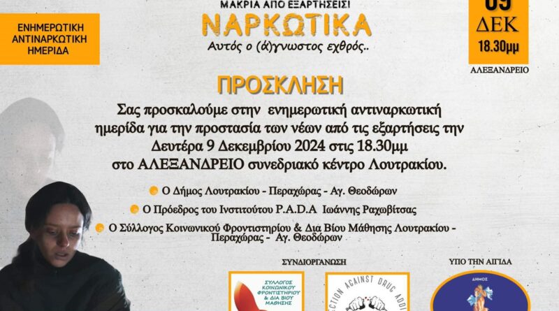 Την Ενημερωτική Αντιναρκωτική Ημερίδα που διοργανώνει ο Σύλλογος Κοινωνικών φροντιστηρίων Λουτρακίου – Περαχώρας – Αγ. Θεοδώρων στις 9 Δεκεμβρίου στο ΑΛΕΞΑΝΔΡΕΙΟ συνεδριακό κέντρο Λουτρακίου