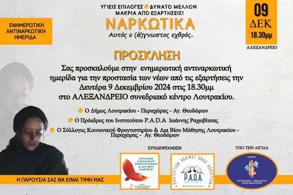 Μετά την επικοινωνία μας με το Ινστιτούτο Αντιναρκωτικής Δράσης P.A.D.A., είναι ιδιαίτερη χαρά μας να φιλοξενήσουμε στο Λουτράκι μία από τις σημαντικότερες εκδηλώσεις που έχουν διοργανωθεί στην περιοχή μας, με καταξιωμένους ομιλητές.