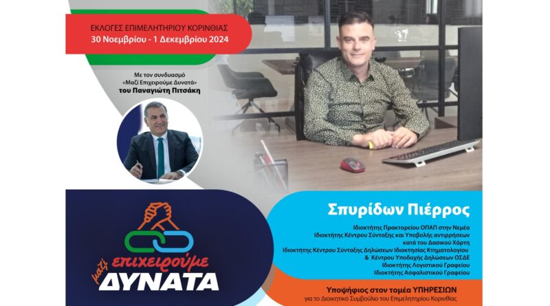 Διαβάστε περισσότεραΣπύρος Πιέρρος – Υποψήφιος για το ΔΣ του Επιμελητηρίου Κορινθίας με τον συνδυασμό ”Μαζί ΕΠΙΧΕΙΡΟΎΜΕ ΔΥΝΑΤΑ” του ΠΑΝΑΓΙΩΤΗ ΠΙΤΣΑΚΗ στον Τομέα Υπηρεσιών!
