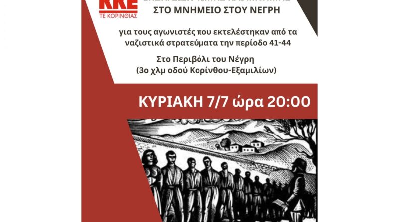Διαβάστε περισσότεραΗ Τομεακή Επιτροπή Κορινθίας του ΚΚΕ καλεί σε εκδήλωση μνήμης και τιμής για τους εκτελεσμένους αγωνιστές στο Μνημείο Νέγρη (3ο