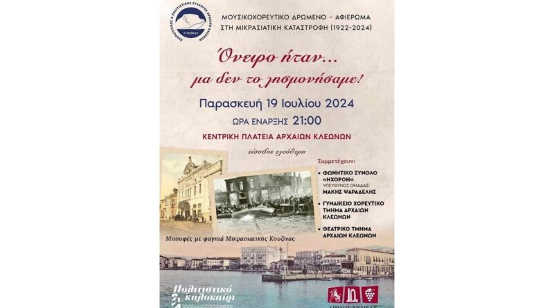 Μουσικό χορευτικό δρώμενο (εκδήλωση μνήμης για τη Μικρά Ασία 1922-2024) Διοργάνωση : Εξωραϊστικός και πολιτιστικός σύλλογος Αρχαίων Κλεωνών ‘’Ο Φώκας’’